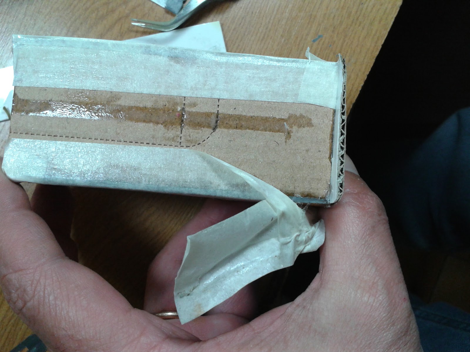 2) Pego cinta de pintor en los laterales de los cartones y junto los cuatro cartones, de manera que la parte impermeable del carton (si la tuviera) quede hacia dentro y asi se monta la caja. Si es posible cerrare la caja por dentro, en las uniones, con mas cinta para pintor para impermeabilizar mas el molde y evitar fugas de silicona mejor.