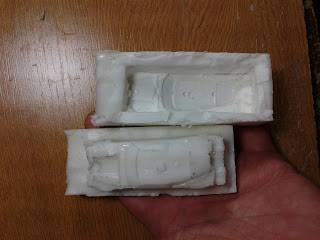 y luego con un cutter o un bisturi comienzo a cortar los bordes de silicona siguiendo la guia de las aletas de papel hasta separar el molde en dos partes. Una la parte que cubre el vehiculo y la segunda la parte que rellena el vehiculo por dentro.